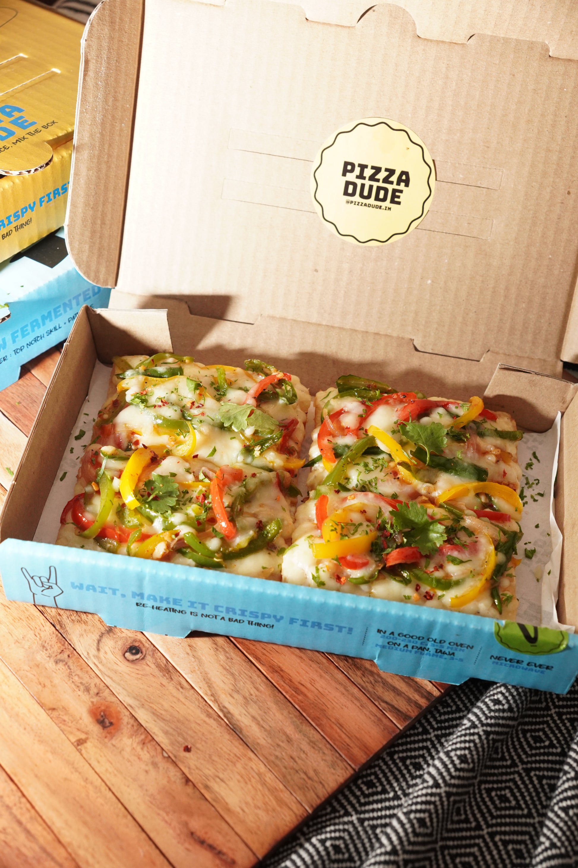 5 minute bake - Roman style sourdough pizza. End to end topped. In-house cheesy white sauce & Dude mozzarella blend topped with onions, peppers & green chilies. Finished with fresh coriander.